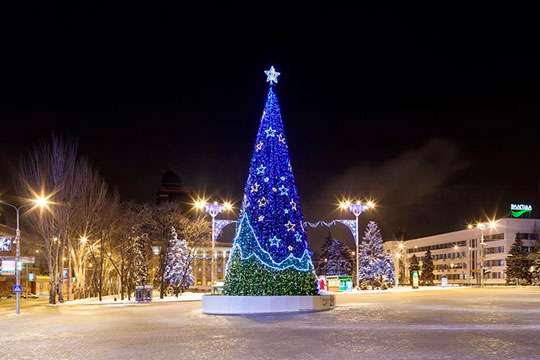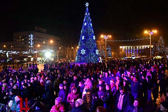 Ради праздника в Донецке на сутки отменили комендантский час. В центре города установили елку, закусочные, включили световой фонтан и фигурки, покрытые иллюминацией.