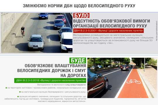 По информации ProfiDOM.com.ua, согласно новой ГСН "Улицы и дороги населенных пунктов", велосипедные дорожки и полосы нужно обустраивать на территориях жилых и промышленных районов, коммунально-складских зон, на магистральных улицах беспрерывного и регулируемого движения, улицах местного значения, сельских и поселковых дорогах, обеспечивающих подъезд велосипедистов к жилым, общественным зданиям, промышленным предприятиям, объектам массового посещения, открытым автостоянкам и гаражам.