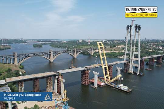 По информации ProfiDOM.com.ua, параллельно идут работы на втором, балочном мосту, от Хортицы до правого берега. Здесь завершили все этапы надвижки пролетного строения, общий вес которой - 3,4 тыс. т.