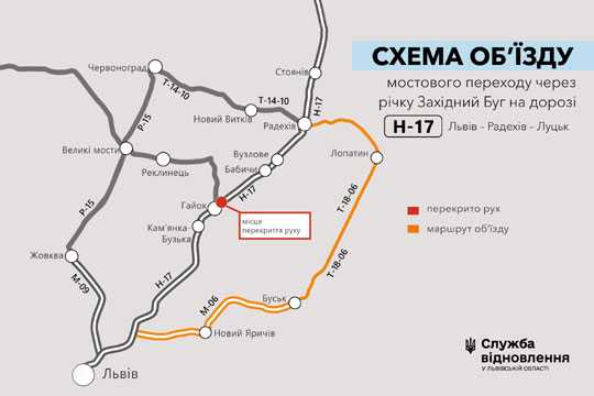На дорозi Н-17 Львiв - Радехiв - Луцьк перекрили рух автомобiльного транспорту через мостовий перехiд через рiчку Захiдний Буг поблизу с. Гайок.