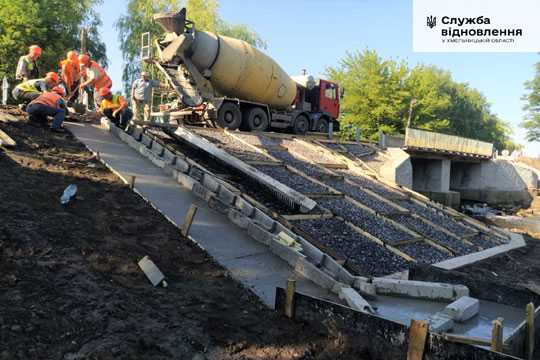Впродовж минулого тижня працiвниками шляхової органiзацiї проведено наступний комплекс робiт: завершено укрiплення откосiв штучної споруди бетоном, влаштовано бортовий камiнь з водоскидним лотком, вiдремонтовано перильну огорожу та вiдновлено цiлiснiсть та пофарбовано колесовiдбiй по обох проїздах.