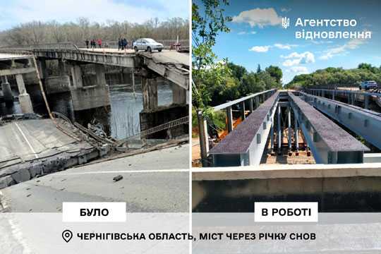 Минулого року Центр з подолання криз та надання пiдтримки (CDCS), який є французьким державним оператором гуманiтарної дiяльностi, передав Агентству вiдновлення 3 мости. Їх виготовила для України компанiя Matiere. Конструкцiї завдовжки 68, 34 i 23 метри спроектували спецiально пiд параметри зруйнованих пiд час бойових дiй переправ у Чернiгiвськiй областi. Монтаж двох мостiв завершили у лютому на дорозi Р-69 Київ - Вишгород - Десна - Чернiгiв.