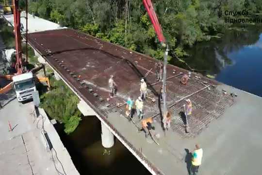 В рамках влаштування монолiтної плити забетоновано 24 балки. Для цього використано 150 куб. м бетону. Паралельно завершено монтаж незйомної опалубки для бетонування останнiх чотирьох прогонiв мосту та розпочато армування монолiтної плити.