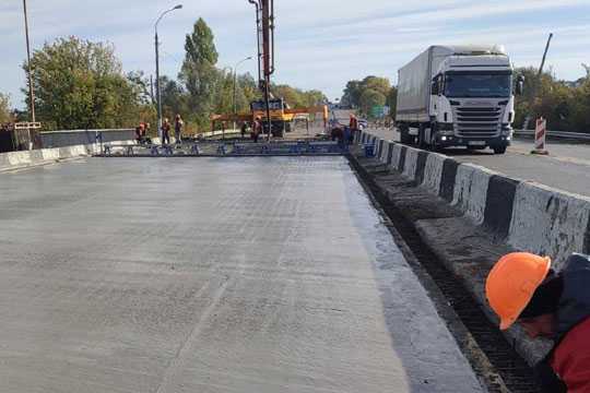 Бригадою пiдрядника завершено влаштування вирiвнюючого цементобетонного шару прогонової будови лiвої смуги штучної споруди, влаштовано деформацiйнi шви.