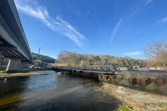 Роботи зi встановлення модульного мосту розпочали влiтку цього року. Пiсля перенаправлення транспорту на нову споруду розпочнуться роботи з вiдновлення зруйнованого.