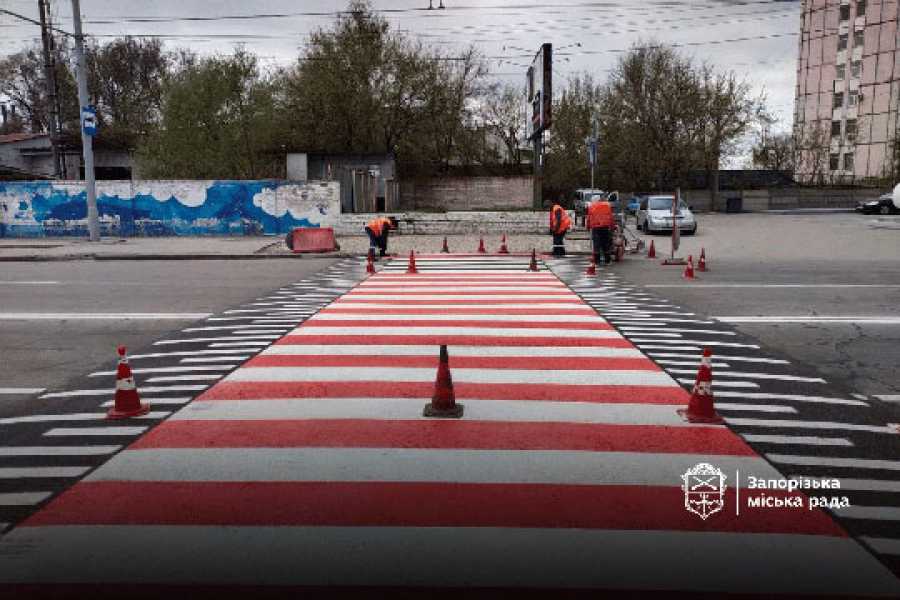 Працiвники КП "ЕЛУАШ" iз застосуванням фарбувальної машини нанесли традицiйну червоно-бiлу "зебру" на аварiйно небезпечнiй дiлянцi дороги зi значним транспортним та пiшохiдним навантаженням.