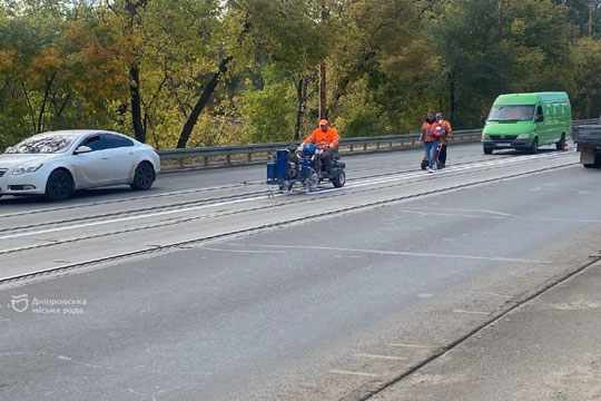У Днiпрi майже повнiстю виконали план з нанесення дорожньої розмiтки У Днiпрi на Амурському мосту нанесли дорожню розмiтку - двi суцiльнi лiнiї, що подiляють транспортнi потоки протилежних напрямкiв.