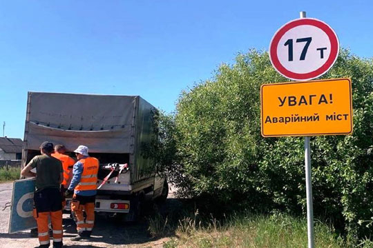 На аварiйних мостах Житомирщини введено ваговi обмеження Завершили встановлювати обмежувальнi знаки поблизу штучних споруд у Житомирськiй областi, що були зведенi бiльше пiвстолiття тому назад та практично повнiстю вичерпали свою здатнiсть утримувати великоваговий транспорт.