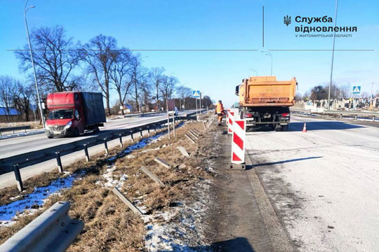 У Житомирськiй областi вiдновлюють пошкодженi елементи технiчних засобiв безпеки дорожнього руху На дiлянках дороги державного значення М-06 Київ - Чоп, де нещодавно трапились дорожньо-транспортнi пригоди, демонтують та приступають до вiдновлення елементiв бар'єрного огородження.