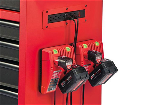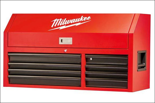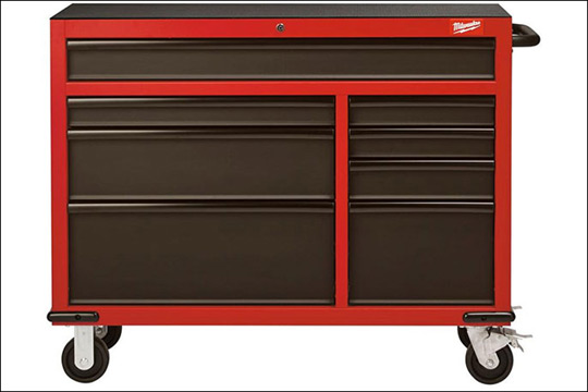 Под модулем закреплены 4 мощных колеса с полипропиленовым покрытием, два из них закреплены жестко, а два вращаются вокруг осей. Колеса рассчитаны на вес 815 кг. В нижнем правом ящике расположен съемный органайзер, в котором имеются отделения для более удобного хранения электроинструмента (аккумуляторных дрелей, шуруповертов, гайковертов и аккумуляторов Milwaukee). Справа расположен блок с 6 розетками, а также монтажные отверстия с резьбой, предназначенные для фиксации зарядных устройств Milwaukee M18 и M12. На нижних углах имеются бамперы, которые должны защитить фасады шкафа и его содержимое от повреждений. Для фиксации поворотных колес предусмотрены большие педали.Сверху установлен цилиндровый замок, запирающий ящики. Стоит отметить, что ключ от верхнего модуля не подойдет к нижнему.