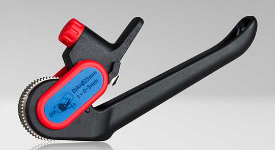 Применяется для снятия оболочки кабеля (ПВХ, ПЭ, резина и другие материалы). Нож оснащен двухсторонним лезвием с трещоткой для регулировки глубины реза от 0 до 5 мм. Может совершать продольный и поперечный рез.