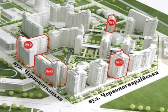 По информации ProfiDOM.com.ua, согласно тендерной документации, общая площадь квартир в домах составит по 14 тыс. кв. м. Кроме того, предусмотрены офисные помещения площадью 500 кв. м. Подземные парковки строить не будут.