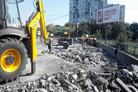 По информации ProfiDOM.com.ua, ведутся работы по ремонту путепровода на пр. Комарова и бул. Гавела. В частности, на объекте проводились работы по монтажу опалубки карнизной части тротуара, демонтаж карнизных блоков и разбор монолитного пояса подпорной стенки со стороны ул. Каблукова.