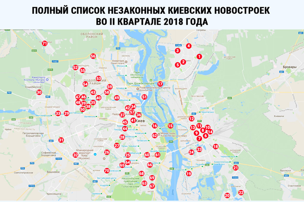 В январе 2018 года в столице было зафиксировано 67 незаконных жилых новостроек . За шесть месяцев их количество возросло, и по состоянию на 2 июля 2018 года в Киеве насчитывается 71 незаконная стройка.
