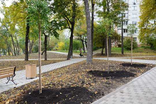 По информации ProfiDOM.com.ua, в сквере обустроили дорожки с ФЭМ-покрытием общей площадью 3480 кв. м, установили новые скамейки и урны. Порядка половины площади сквера занимают посевные газоны.