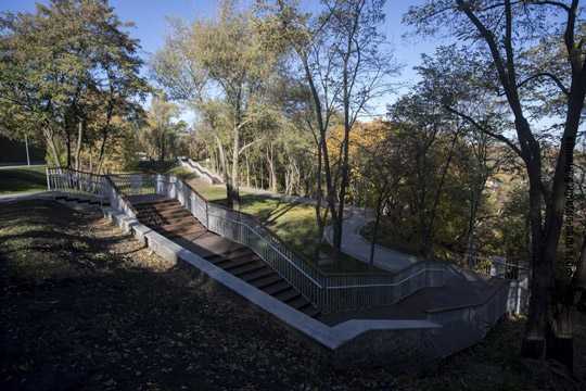 Кроме верхней террасы, в рамках реконструкции аллеи обустроили нижнюю террасу склона и построили новую лестницу на Воздвиженку. Она сделана в том же стиле, что и лестница к урочищу Кожемяки, которую открыли три года назад. На новой лестнице также будет вечерняя подсветка.