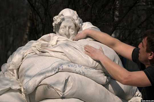 Война закончится, а памятники останутся. Возле памятника княгине Ольге также кипит работа - волонтеры песком наполняют мешки и обкладывают три мраморные скульптуры.