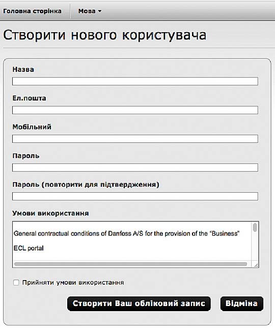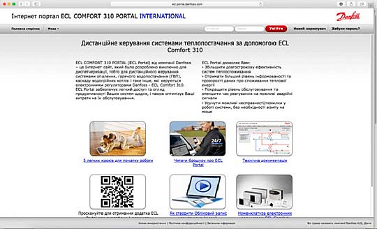 Попередньо вам треба зайти на сайт http://ecl.portal.danfoss.com, який називається «Інтернет портал ECL COMFORT 310 PORTAL INTERNATIONAL» та створити на ньому власний обліковий запис, як це зробити буде далі.