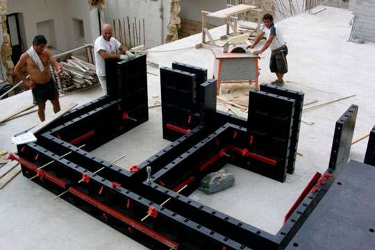 Армирование стен осуществляется в соответствии с проектом. Опалубку после выставления и фиксации заливают бетоном, который готовится на стройплощадке или привозится с ближайшего завода. Если вы задались вопросом о том, как строить дом по технологии Velox, то должны знать, что методика предусматривает устройство монолитных перекрытий, для которых устанавливаются деревянные или инвентарные стойки и балки. На них укладывается опалубка перекрытия, которая имеет вид пустотных коробов «Велокс». Для этого могут использоваться ещё и плиты «Велокс».