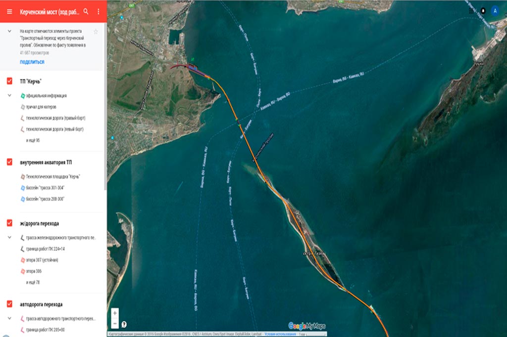На карте отмечаются элементы проекта «Транспортный переход через Керченский пролив». Обновление по факту появления в открытом доступе фото и видео, а также официальных отчетов.