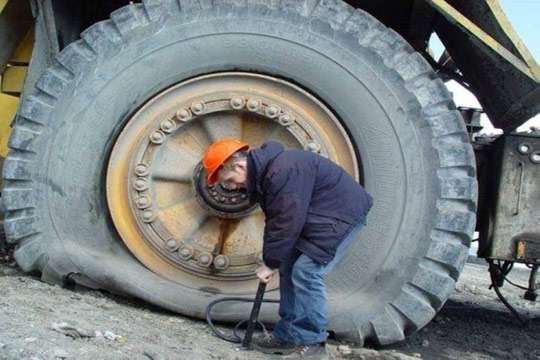 На такое способны только наши люди: большегрузные автомобили, обычно, имеют систему подкачки шин. Однако, порой, возникают ситуации, когда нужно накачать эти шины по-другому.