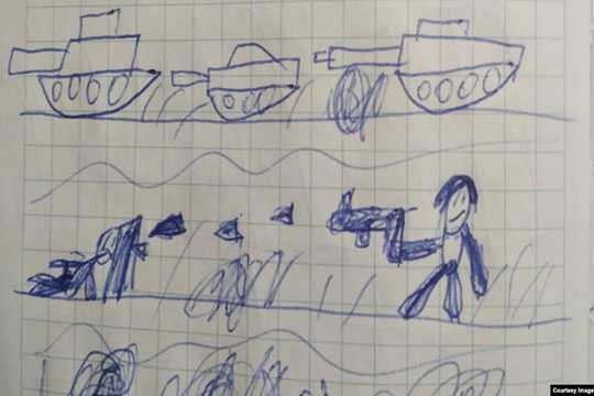 Дедушку Егор вспоминает часто. В Мариуполе мужчина получил ранение и умер от потери крови. Похоронили дедушку в огороде. В дневнике Егор описывал все, что видел вокруг. На страницах блокнота есть рисунки умерших людей, военных с оружием, танки и горящие дома.