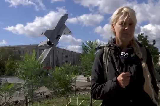 С центральной площади города пытается взмыть в небо советский военный самолет, но с памятника с вечным огнем исчезло выражение "героическая советская армия".