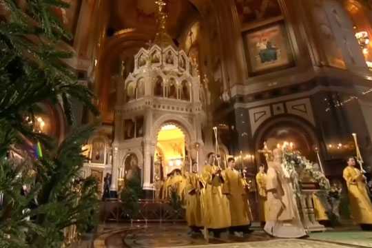 В то время когда митрополит Епифаний служил Рождественскую службу в Киево-Печерской лавре, патриарх Московский и Всея Руси Кирилл служил в Кафедральном соборе РПЦ - Храме Христа Спасителя в Москве. Службу показывали в эфире российских государственных каналов. На 96-ой минуте трансляцию на время прервали, чтобы показать еще одну литургию, которую, если верить словам комментаторов, служили в Благовещенском соборе Московского Кремля - специально для Путина. В помещении с Путиным были только три священнослужителя, и, вероятно, оператор, который это снимал.