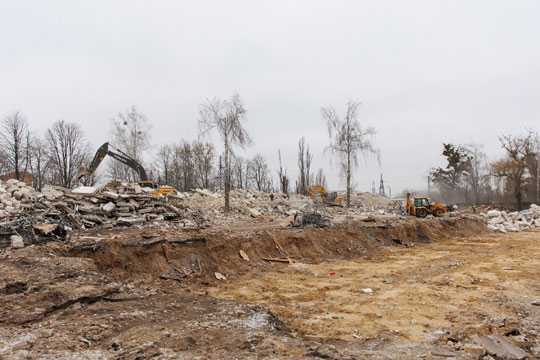 Демонтаж вдалося провести в найкоротшi термiни. Розбiр першого з чотирьох будинкiв було розпочато 20 сiчня, а в серединi лютого прибула i була встановлена спецiальна технiка, що виконує функцiю переробки будiвельного смiття.