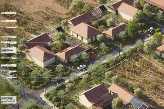 Кожне домоволодiння вiдбудовуватимуть за принципом напiвзакритого внутрiшнього двору, що дає змогу закрити подвiр'я вiд сильних степових вiтрiв. Також запропоновано облаштувати по периметру кожного двору перголи та галереї, сформувавши патiо.
