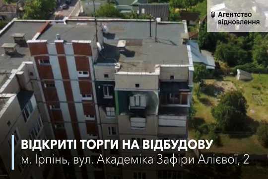 У Київськiй областi буде реалiзовано 10 об'єктiв вiдновлення житлової iнфраструктури та одна адмiнбудiвля. На першi шiсть об'єктiв вiдновлення вже проведено тендернi процедури, до 1 серпня будуть визначенi переможцi ще 5 об'єктiв.