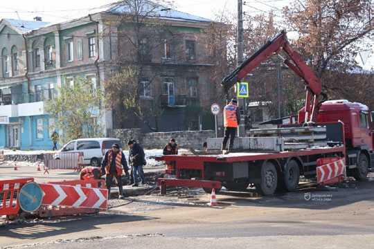 "Тут була аварiйна дiлянка, й пiдприємство вирiшило провести ремонт. Роботи виконуються без перекриття руху автомобiльного транспорту", - зазначив головний iнженер КП "Днiпровський електротранспорт" Володимир Легкий.