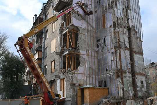 Активно тривають роботи з вiдбудови трьох житлових будинкiв. У багатоповерхiвцi по вул. Незалежної України, 67, зараз пiдрядники демонтують конструкцiї балконiв, залiзобетонних плит перекриття та залiзобетонних стiнових блокiв. Цi роботи виконали вже на 90%. Також проводять демонтаж у квартирах другого пiд'їзду, вивозять будiвельне смiття.