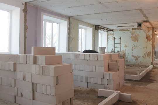 Будiвельники вже завершили демонтаж пошкоджених цегляних перегородок, продовжують роботи з улаштування нових перегородок i прокладання магiстралей комунiкацiй. Розпочали штукатурення стiн.