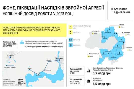 Серед прiоритетних проєктiв Агентства вiдновлення, якi реалiзуються коштом фонду, - будiвництво магiстрального водогону, який забезпечить водою понад мiльйон мешканцiв у громадах, постраждалих вiд пiдриву Каховської ГЕС. На це спрямовано 8,5 млрд. грн.