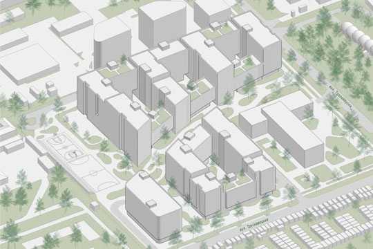 "Маємо житловi квартали, а також нежитловi примiщення та будiвлi в пiвденнiй частинi, ближче до гаражного кооперативу, де санiтарна зона не дає можливiсть розташувати житло. Так само передбачається офiсна будiвля в пiвденно-захiднiй частинi. Це вже вiдкоригований варiант проєкту. Тут суттєво пониженi показники житлової забудови, середня висотнiсть. Житловi будинки є на 4, 7, 8 поверхiв та лише одна дев'ятиповерхiвка - такий просторовий акцент на кутi", - зазначив Антон Коломєйцев.