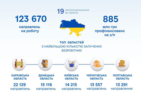 Серед регiонiв iз найбiльшою кiлькiстю залучених безробiтних також Донецька (15116 направлень), Київська (14215), Чернiгiвська (13557) та Полтавська (13291) областi.