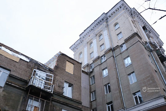 У Днiпрi тривають роботи з вiдновлення будинку, постраждалого вiд ракетного удару рф 19 квiтня.