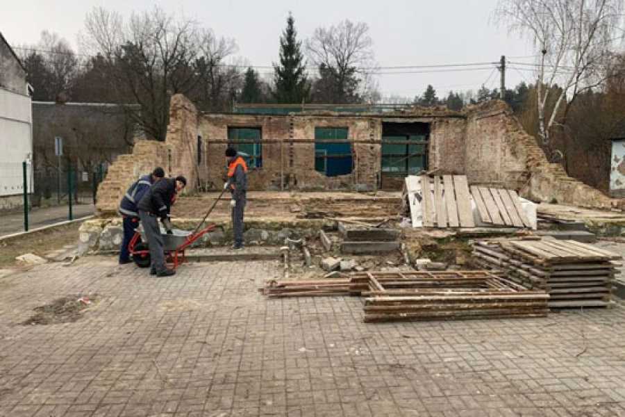 Як уточнили в ЛКП "Рембуд", працiвники вже вирiвняли дiлянку, на якiй будуть проводити пiдготовчi та вiдновлювальнi роботи, встановили риштування, вивезли смiття. Пiд час розчистки територiї виявлено кiлька цiнних елементiв, якi надалi будуть використовувати у вiдбудовi чи експозицiї музею, їх передали на зберiгання - мова про дахове покриття, елементи сходинок, нiжку вiд стола, шматки автомата, який був частиною експозицiї музею. Також збережено бетоннi клумби. Їх використання надалi будуть вирiшувати архiтектори.