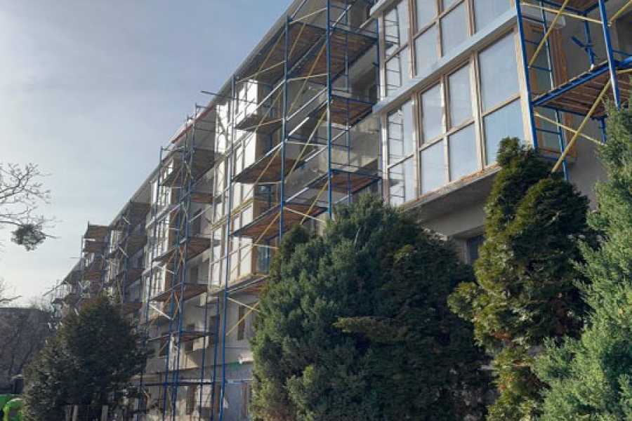 Також будiвельники вiдновили фасаднi роботи, ведуться роботи з облицювання плиткою санвузлiв та пiдлоги у квартирах.