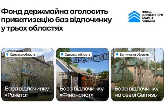 Фонд держмайна збирається продати три бази вiдпочинку У 2024 р. команда Фонду держмайна виставить на приватизацiю бази вiдпочинку у Одеськiй та Волинськiй областях. Про це повiдомляють на сторiнцi у соцмережi фонду.