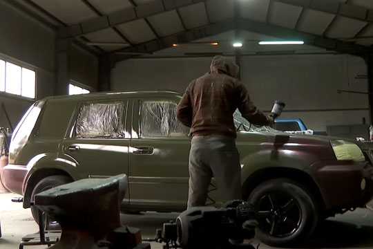 Пока Ярослав перекрашивает кузов из вишневого цвета в хаки, Виталий заклеивает пленкой окна еще одному внедорожнику. Обе машины готовят для украинских защитников. Одну - для погранотряда под Харьков, вторую - для Вооруженных сил Украины на Донбасс.