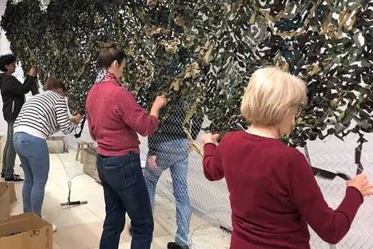Плести маскировочные сети - дело не совсем простое. Нужно закупить сети-основу и ткань природных цветов в соответствии с временем года. Например, сейчас это - черный, коричневый, зеленый, песочный, хаки. После необходимо нарезать ткань определенным образом и вплести в сеть максимально приближенно к естественной расцветке. Здесь не обойтись без совета и присмотра со стороны более опытного члена команды. Одним словом, это дело времени, важно набить руку и наметить глаз, но само по себе занятие весьма медитативное и даже немного творческое.