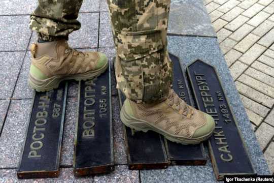 Украинский военнослужащий наступил на таблички с названиями городов России после того, как они были демонтированы с декоративного уличного знака в Одессе, 14 апреля 2022 года