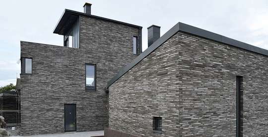 Ригельный кирпич — это разновидность клинкерного, его название происходит от формы камня — широкой пластины, длина которой может достигать 100–120 см при высоте 4 см. За счет этого создается более подробный рисунок, которому присущ камуфляжный эффект. На стене, особенно с большого расстояния, трудно различить подробности расшивки, которая для ригельной кладки обычно подбирается в тон, а не в контраст. Кроме того, повышается однородность цвета: даже если в одной партии кирпича есть расхождение по оттенку, оно меркнет из-за маленького размера контрастных участков.