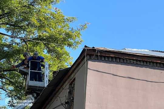 По iнформацiї ProfiDOM.com.ua, заступник головного iнженера комунального пiдприємства "Жилсервiс-5" Олег Морозюк розповiв: "Пiсля ракетного обстрiлу майстри нашого пiдприємства обстежили будинки, якi поруч з епiцентром вибуху, i виявили п'ять будiвель, де постраждали покрiвлi. Нинi розпочали замiну даху в одному з таких домiв. При роботах використовуємо якiснi матерiали. Замiсть пошкодженого шиферу укладаємо профнастил. Пiд ним укладаємо гiдробар'єр, аби не було вологи i протiкань. А ще улаштуємо водостiчну трубу та систему громозводу".