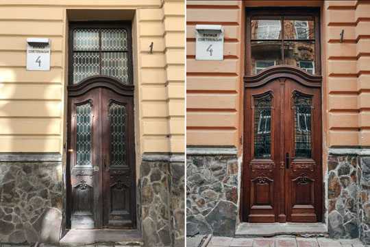 Фахiвцi вирiвняли деформовану дверну коробку, вiдновили пошкоджене дерев'яне полотно та втраченi елементи, встановили нове засклення та ручки, що вiдповiдають iсторичним аналогам.