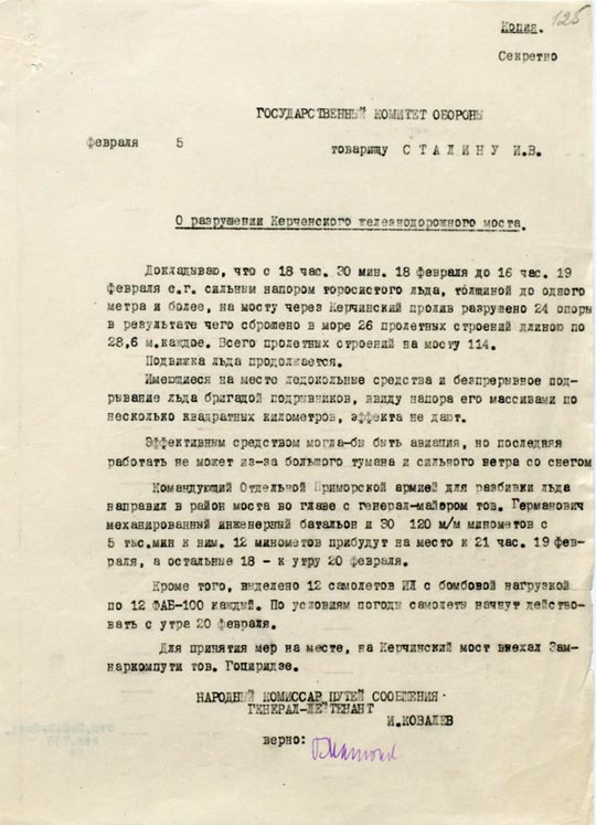 Докладная записка наркома путей сообщения СССР И.В. Ковалева председателю Государственного комитета обороны СССР И.В. Сталину о разрушении Керченского железнодорожного моста.