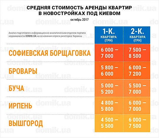 По сведениям Национальной энциклопедии строителства ProfiDom.com.ua, портал Domik.ua провел анализ этого вопроса: стоимость аренды одно- и двухкомнатных квартир в новых жилых комплексах, расположенных в Киевской области.