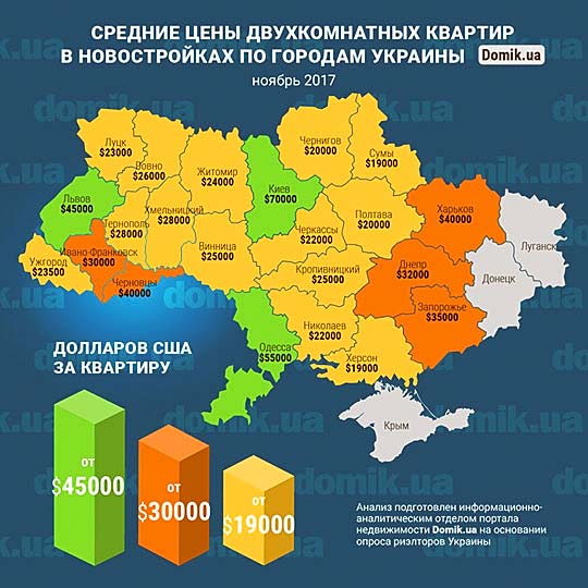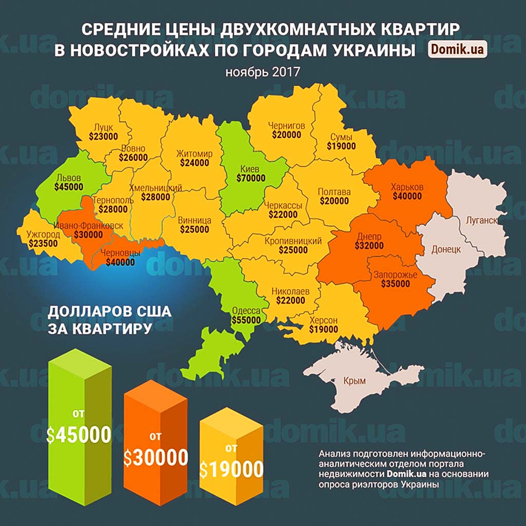 Купить двухкомнатное жилье дороже всего можно в новостройках, расположенных в Киеве — в среднем за $70000. Среди остальных центральных регионов Украины, наивысшие показатели прослеживаются в Днепре — $32000. Недорогие цены на покупку квартир в новых жилых комплексах выявлены в Полтаве — $22000.